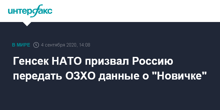 Москва. 4 сентября. INTERFAX.RU - Генсек НАТО Йенс Столтенберг призвал РФ в полной мере сотрудничать с Организацией по запрещению химоружия для проведения международного расследования в связи с отравлением оппозиционера Алексея Навального.