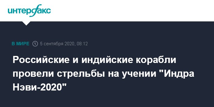 Москва. 5 сентября. INTERFAX.RU - Корабли Тихоокеанского флота (ТОФ) и ВМС Индии провели артиллерийские стрельбы в ходе двустороннего военно-морского учения "Индра Нэви-2020", которое проходит в Бенгальском заливе и Андаманском море, сообщила пресс-служба Тихоокеанского флота.