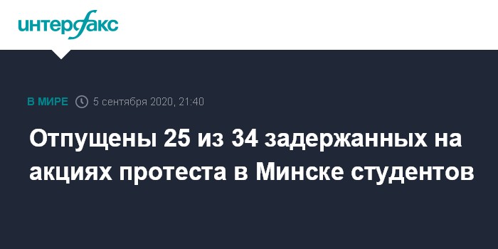 Москва. 5 сентября. INTERFAX.RU - Отпущены 25 из 34 студентов, которые были задержаны на акциях протеста в Минске в субботу, сообщила корреспонденту "Интерфакс" официальный представитель ГУВД Мингорисполкома Наталья Ганусевич.