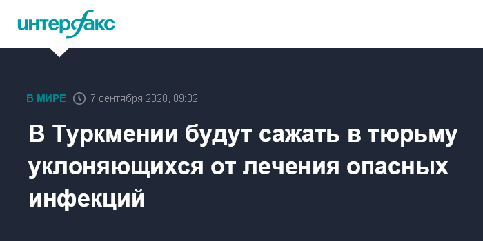 Москва. 7 сентября. INTERFAX.RU - Власти Туркменистана на фоне угрозы коронавируса COVID-19 приняли поправки в Уголовный кодекс республики, согласно которым лицам, бежавшим из больниц, или уклоняющимся от лечения "опасных инфекционных заболеваний", грозит лишение свободы до двух лет, а в случае повторного нарушения - до пяти лет.