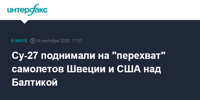 Москва. 8 сентября. INTERFAX.RU - Истребитель Су-27 "перехватил" самолеты-разведчики ВВС США и Швеции над Балтийским морем, сообщил Национальный центр управления обороной РФ.