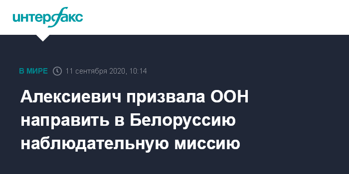Москва. 11 сентября. INTERFAX.RU - Лауреат Нобелевской премии по литературе Светлана Алексиевич, председатель Белорусской ассоциации журналистов Андрей Бастунец и генеральный секретарь организации "Репортеры без границ" (РБГ) Кристоф Делуар в совместном обращении призвали Генеральную ассамблею ООН направить в Белоруссию миссию наблюдателей.