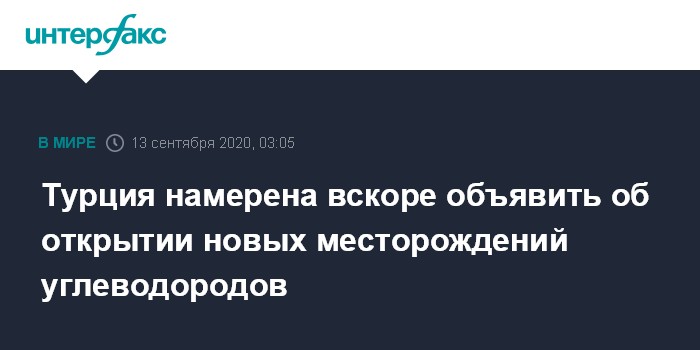 Москва. 13 сентября. INTERFAX.RU - Власти Турции в скором времени могут объявить об открытии новых месторождений углеводородов в Средиземном и Черном морях, заявил в субботу турецкий министр энергетики Фатих Донмез. Об этом пишет агентство "Анадолу".