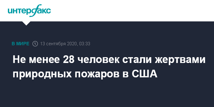 Москва. 13 сентября. INTERFAX.RU - Не менее 28 человек погибли в результате природных пожаров на западном побережье США, сообщает CNN.