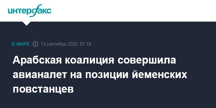 Москва. 13 сентября. INTERFAX.RU - Самолеты сил арабской коалиции под руководством Саудовской Аравии совершили утром в воскресенье налет на объекты йеменских повстанцев-хуситов, сообщил телеканал Al Arabiya.