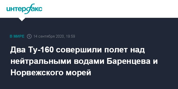 Москва. 14 сентября. INTERFAX.RU - Российские стратегические ракетоносцы Ту-160 выполнили 10-часовой полет над нейтральными водами Баренцева и Норвежского морей, сообщили в Минобороны РФ.