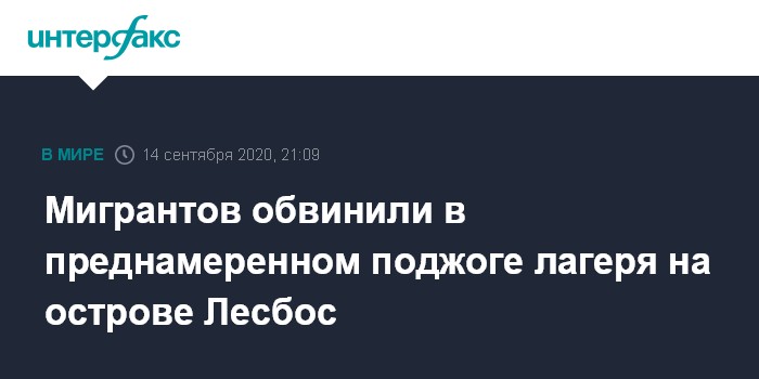 Москва. 14 сентября. INTERFAX.RU - Греческие власти в понедельник обвинили мигрантов в сознательном поджоге лагеря "Мория" на острове Лесбос на прошлой неделе.