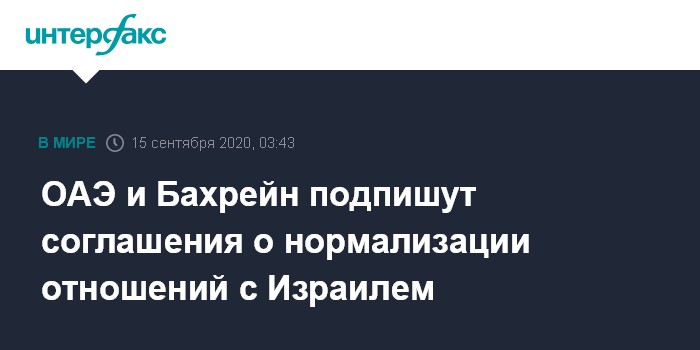 Москва. 15 сентября. INTERFAX.RU - В Вашингтоне во вторник пройдет церемония, в ходе которой ОАЭ и Бахрейн подпишут соглашение о нормализации дипломатических отношений с Израилем.