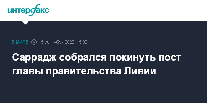 Москва. 15 сентября. INTERFAX.RU - Глава правительства национального согласия (ПНС) Ливии, базирующегося в Триполи и признанного на международном уровне, Файез Саррадж на этой неделе планирует покинуть свой пост, сообщает во вторник агентство Bloomberg со ссылкой на собственные источники.
