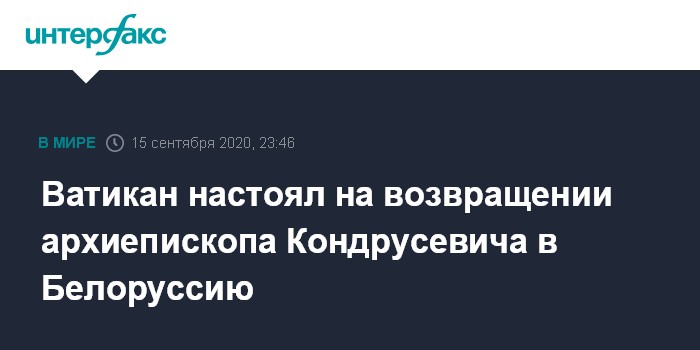 Москва. 15 сентября. INTERFAX.RU - Ватикан настаивает на возвращении в Белоруссию митрополита Минско-Могилевского, председателя Конференции католических епископов в Белоруссии Тадеуша Кондрусевича.