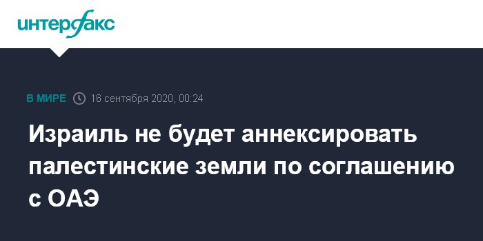 Москва. 16 сентября. INTERFAX.RU - В соответствии с соглашением о нормализации отношений между ОАЭ и Израилем, Тель-Авив приостанавливает реализацию плана аннексии части территории Западного берега реки Иордан как минимум на четыре года, сообщают израильские СМИ.