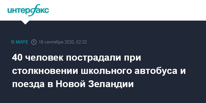 Москва. 16 сентября. INTERFAX.RU - Десятки человек пострадали в результате столкновения школьного автобуса и поезда на железнодорожном переезде близ города Палмерстон-Норт в Новой Зеландии.
