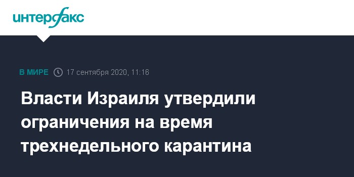 Москва. 17 сентября. INTERFAX.RU - Правительство Израиля в четверг утром определило ограничения, которые будут действовать с 18 сентября по 11 октября в стране, чтобы замедлить скорость распространения коронавируса COVID-19, пишут израильские СМИ.