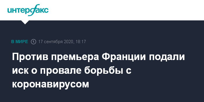Москва. 17 сентября. INTERFAX.RU - Группа переболевших коронавирусом и родственники пациентов подали иск против премьер-министра Франции Жана Кастекса, обвинив его в неудачной политике касательно пандемии COVID-19, передает в четверг агентство Associated Press (AP).