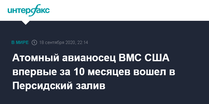 Москва. 18 сентября. INTERFAX.RU - Американская авианосная ударная группа во главе с атомным авианосцем USS Nimitz (CVN-68), пройдя Ормузский пролив, впервые за последние десять месяцев вошла в акваторию Персидского залива, сообщил в пятницу 5-й оперативный флот ВМС США.