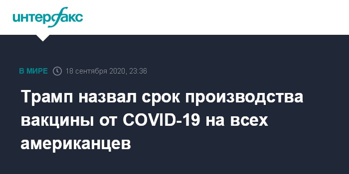 Ранее на этой неделе Трамп заявлял, что в США широкое распределение среди населения вакцины против коронавируса COVID-19 стартует в октябре, а к концу 2020 года будет готово 100 млн доз вакцины. Позже на пресс-конференции президент добавил, что при неудачном развитии событий вакцину в США придётся подождать чуть дольше - "в ноябре или в крайнем случае - в декабре".