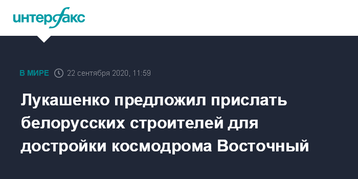 Москва. 22 сентября. INTERFAX.RU - Белорусские строители готовы принять участие в достройке объектов российского космодрома Восточный, заявил президент Белоруссии Александр Лукашенко на встрече с губернатором Приморского края Олегом Кожемяко в Минске. Он отметил, что президент Владимир Путин "просил" его "посмотреть", передает "БелТА".