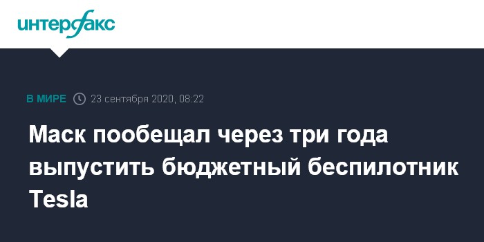 Москва. 23 сентября. INTERFAX.RU - Основатель Tesla Илон Маск пообещал, что "года через три" компания будет выпускать доступный электромобиль-беспилотник стоимостью $25 000 (1,9 млн рублей по нынешнему курсу). Как передает ВВС, он сказал об этом на презентации для акционеров Battery Day, посвященной запуску производства новых мощных батарей.
