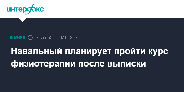 Москва. 23 сентября. INTERFAX.RU - Оппозиционер Алексей Навальный после выписки из больницы Charite будет проходить курс физиотерапии, в будущем он, возможно, обратится в центр реабилитации.