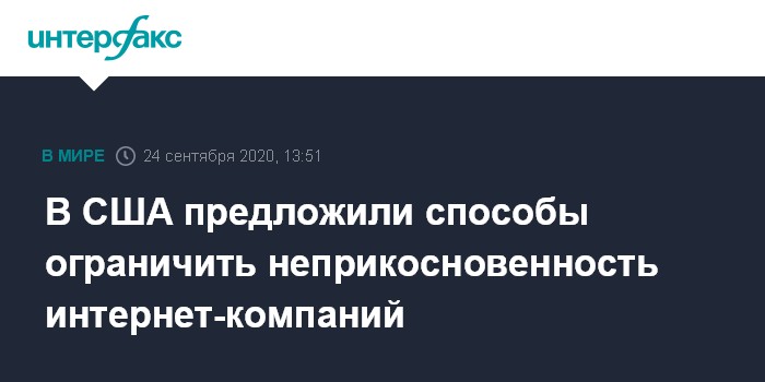 Москва. 24 сентября. INTERFAX.RU - Министерство юстиции США предложило Конгрессу способы ограничить юридическую защиту технологических компаний, включая Facebook Inc, Google и Twitter Inc, и заставить их нести больше ответственности за управление контентом на своих платформах.