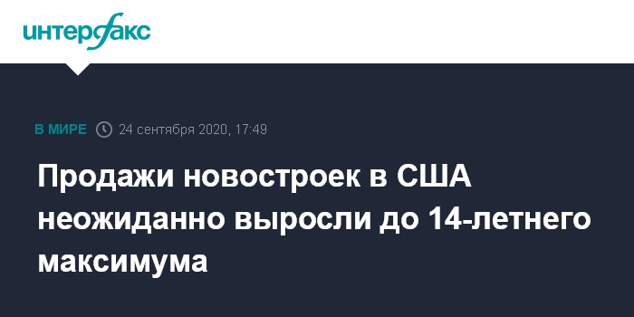 Москва. 24 сентября. INTERFAX.RU - В августе продажи новых домов в США выросли на 4,8% по сравнению с июлем и составили 1,011 млн в пересчете на годовые темпы, сообщил Минторг. Показатель достиг максимума с сентября 2006 года на фоне выхода рынка из "коронавирусного" кризиса и рекордно низких ипотечных ставок, отмечает Trading Economics.