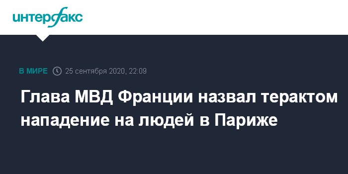Москва. 25 сентября. INTERFAX.RU - Глава МВД Франции Жеральд Дарманен заявил, что произошедшее в пятницу нападение в Париже является террористическим актом, совершенным сторонником радикального ислама.