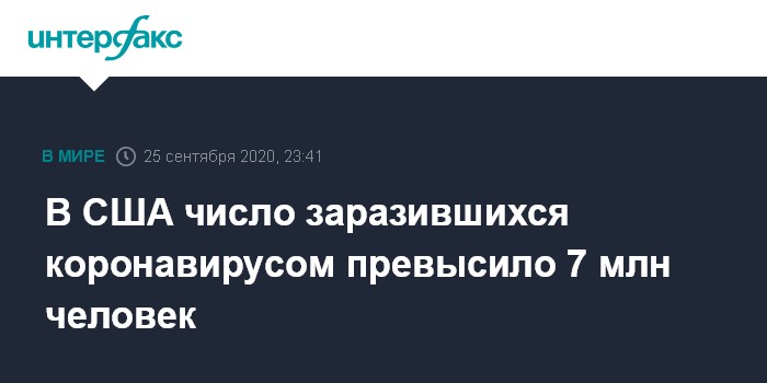 Москва. 25 сентября. INTERFAX.RU - Число заразившихся коронавирусом COVID-19 с начала пандемии в США превысило 7 миллионов человек, свидетельствуют данные университета Джонса Хопкинса.