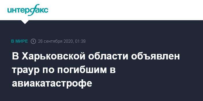 Москва. 26 сентября. INTERFAX.RU - Суббота, 26 сентября, объявлена в Харьковской области Украины днем траура по погибшим в результате падения самолета Ан-26 под Чугуевом. Соответствующее распоряжение подписал глава Харьковской областной администрации Алексей Кучер.