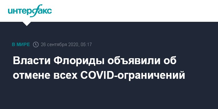 Москва. 26 сентября. INTERFAX.RU - Власти штата Флорида приняли решение полностью отменить все ограничения, введенные для сдерживания распространения коронавируса COVID-19, сообщила газета The Hill.