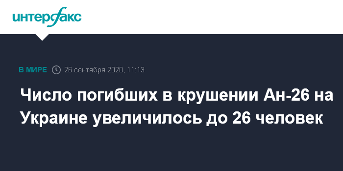Москва. 26 сентября. INTERFAX.RU - Один из пострадавших в результате крушения военного самолета Ан-26 в Харьковской области Украины, госпитализированный в тяжелом состоянии, скончался в больнице.