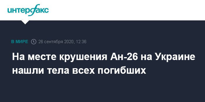 Москва. 26 сентября. INTERFAX.RU - В районе крушения военного самолета Ан-26 в Харьковской области обнаружены тела еще двух погибших, сообщает в субботу Государственная служба Украины по чрезвычайным ситуациям.