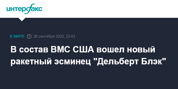 Москва. 26 сентября. INTERFAX.RU - Новый американский ракетный эсминец USS Delbert D. Black (DDG 119) класса Arleigh Burke (Арли Берк) в субботу официально вошел в боевой состав ВМС США в ходе церемонии состоявшейся в Порт-Канаверал в штате Флорида, сообщил Пентагон.