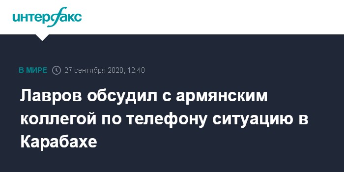 Москва. 27 сентября. INTERFAX.RU - Министр иностранных дел России Сергей Лавров провел телефонный разговор с главой МИД Армении Зограбом Мнацаканяном, обсуждалось положение в зоне нагорно-карабахского конфликта, сообщает в воскресенье МИД РФ.