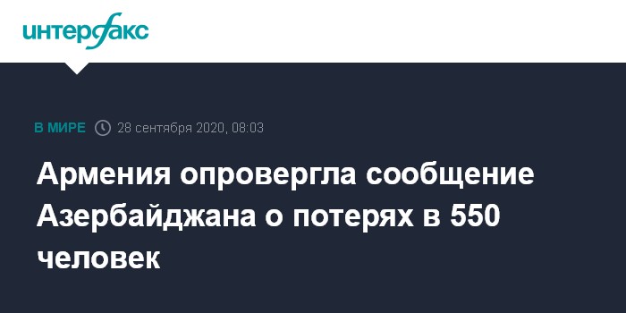 Москва. 28 сентября. INTERFAX.RU -Министерство обороны Армении опровергло сообщение азербайджанской стороны о 550 убитых в Карабахе армянских военнослужащих.