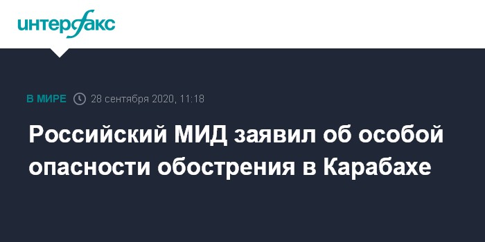 Москва. 28 сентября. INTERFAX.RU - Последнее обострение ситуации в Нагорном Карабахе представляет особую опасность, стороны впервые с 2016 года начали применять тяжелые вооружения, заявил журналистам замглавы МИД России Андрей Руденко.
