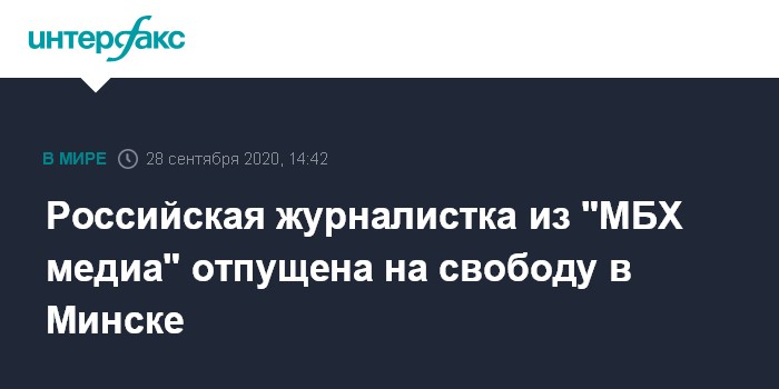 Москва. 28 сентября. INTERFAX.RU - Задержанную во время протестной акции в Минске в субботу журналистку "МБХ медиа" Анастасию Ольшанскую оштрафовали и отпустили из изолятора, сообщает издание.