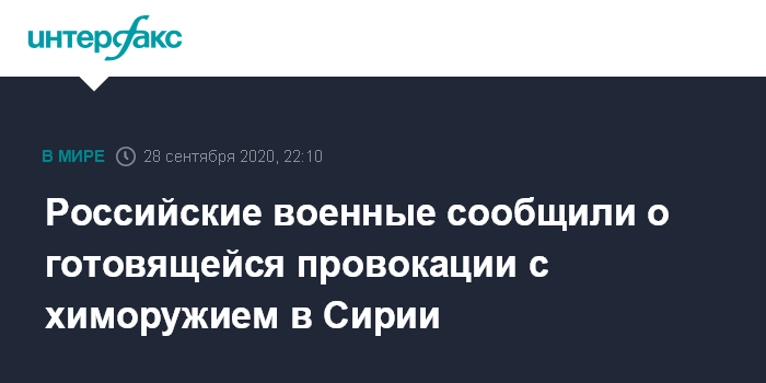Москва. 28 сентября. INTERFAX.RU - В Сирии боевики готовят очередную провокацию с использованием отравляющих веществ в южной части Идлибской зоны деэскалации, сообщил замруководителя российского Центра по примирению враждующих сторон в САР контр-адмирал Александр Гринкевич на брифинге в понедельник.