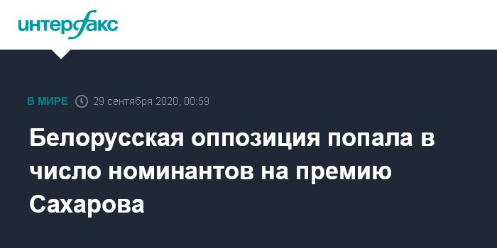 Москва. 29 сентября. INTERFAX.RU - Из выдвинутых в 2020 году кандидатов на премию имени Андрея Сахарова "За свободу мысли" самую мощную поддержку в Европарламенте предварительно получает демократическая оппозиция Белоруссии.