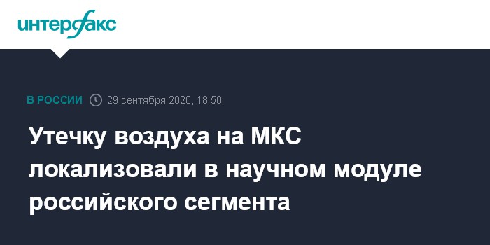 Москва. 29 сентября. INTERFAX.RU - Выявленная в августе утечка воздуха на МКС, как оказалось, происходит в российском сегменте, в служебном модуле "Звезда", где находится научная аппаратура, сообщили в пресс-службе "Роскосмоса". Утечку там оценили как незначительную и неопасную для экипажа.