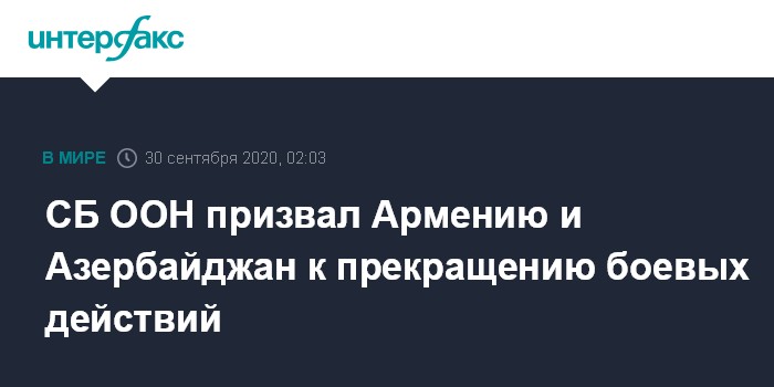 Москва. 30 сентября. INTERFAX.RU - Члены Совета Безопасности ООН призвали Азербайджан и Армению к немедленному прекращению боевых действий и возращению к конструктивным переговорам.