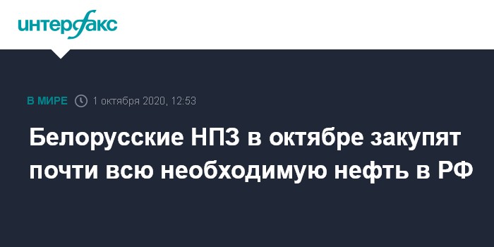 Москва. 1 октября. INTERFAX.RU - Поставки нефти на белорусские НПЗ в октябре 2020 года составят 1,7 млн тонн, в том числе 1,65 млн тонн составят поставки из России, сообщил журналистам в четверг пресс-секретарь концерна "Белнефтехим" Александр Тищенко.