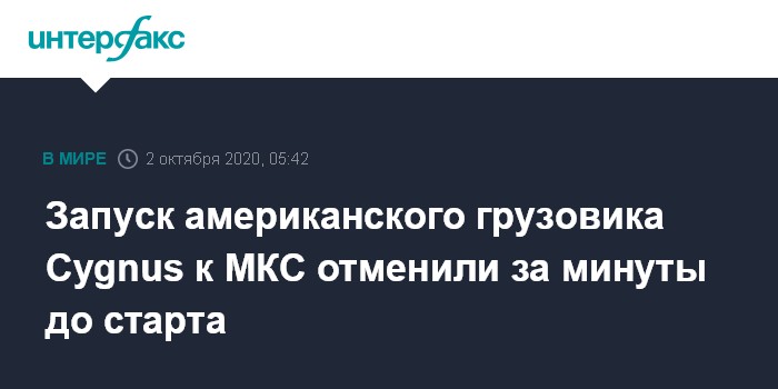 Москва. 2 октября. INTERFAX.RU - Из-за технических проблем запуск грузового космического корабля Cygnus американской компании Northrop Grumman, который в пятницу по московскому времени должен был отправиться к Международной космической станции (МКС), был отменен за две минуты 40 секунд до старта, сообщило Национальное управление США по аэронавтике и исследованию космического пространства (НАСА).