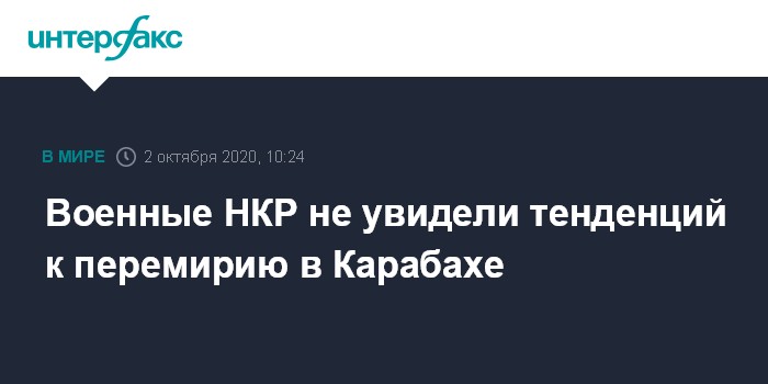 Москва. 2 октября. INTERFAX.RU - Минобороны непризнанной Нагорно-Карабахской республики (НКР) не видит тенденций для прекращения огня в Нагорном Карабахе, заявил на брифинге в пятницу замглавы оборонного ведомства НКР Артур Саркисян.