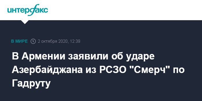 Москва. 2 октября. INTERFAX.RU - Вооруженные силы Азербайджана нанесли новый удар по городу Гадрут в непризнанной Нагорно-Карабахской республике (НКР) с использованием РСЗО "Смерч", сообщил в пятницу представитель Минобороны Армении Арцрун Ованнисян.