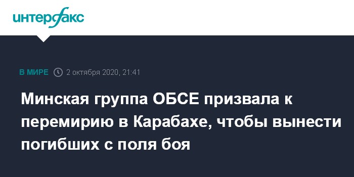 Москва. 2 октября. INTERFAX.RU - Сопредседатели Минской группы ОБСЕ выступили с очередным заявлением в связи с эскалацией армяно-азербайджанского Нагорно-карабахского конфликта.
