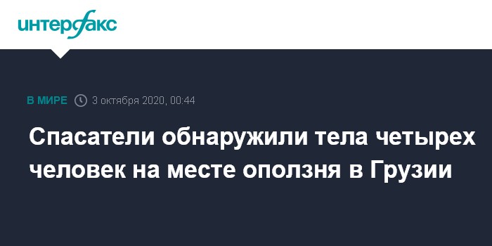Москва. 3 октября. INTERFAX.RU - В ходе поисковых работ, которые вторые сутки в непрерывном режиме ведутся в селе Джочо Хелвачаурского муниципалитета Аджарии (Грузия), где после сильных дождей сошел оползень массой примерно в 40 тысяч тонн, спасатели обнаружили под завалами тела четырех человек.