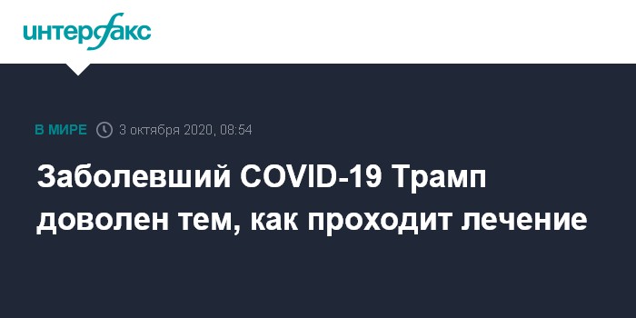 Москва. 3 октября. INTERFAX.RU - Президент США Дональд Трамп, заразившийся коронавирусом COVID-19, заявляет, что его лечение проходит хорошо.