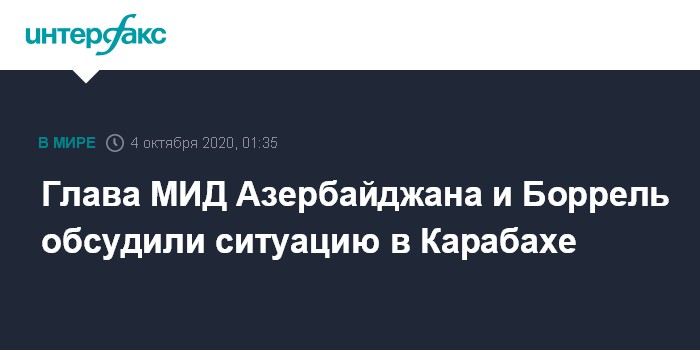 Москва. 4 октября. INTERFAX.RU - Глава МИД Азербайджана Джейхун Байрамов и Высокий представитель Евросоюза по иностранным делам и политике безопасности Жозеп Боррель в ходе телефонного разговора обсудили ситуацию в зоне нагорно-карабахского конфликта.