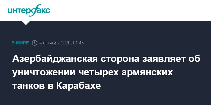 Москва. 4 октября. INTERFAX.RU - Министерство обороны Азербайджана сообщило, что за сутки в Мадагиз-Агдеринском направлении фронта в Карабахе были подбиты 4 танка противника.