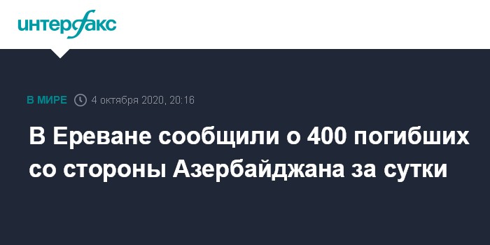 Москва. 4 октября. INTERFAX.RU - Представитель Минобороны Армении Арцрун Ованнисян утверждает, что военные Азербайджана потеряли в воскресенье, 4 октября, в боях в Карабахе убитыми 400 человек.